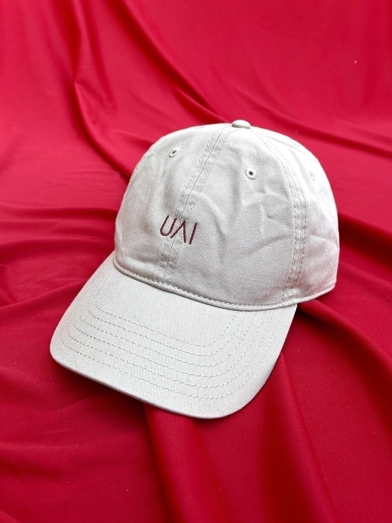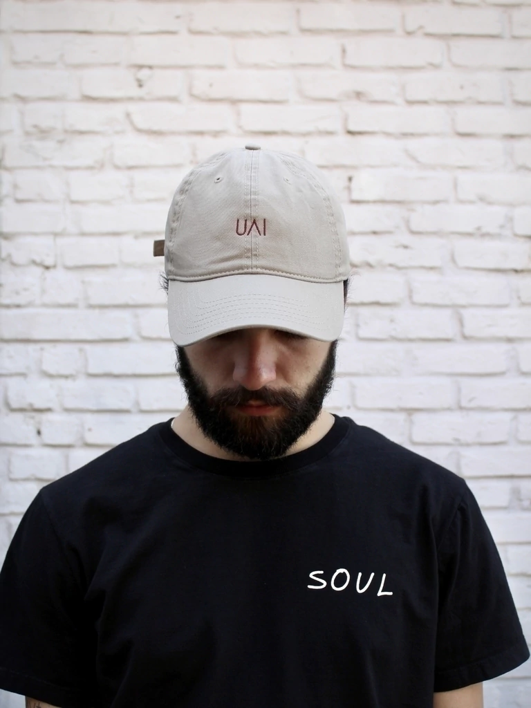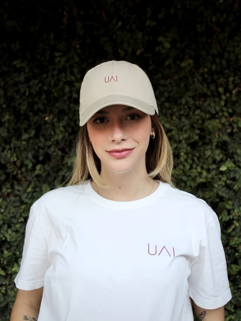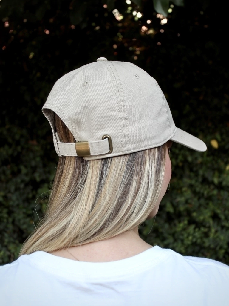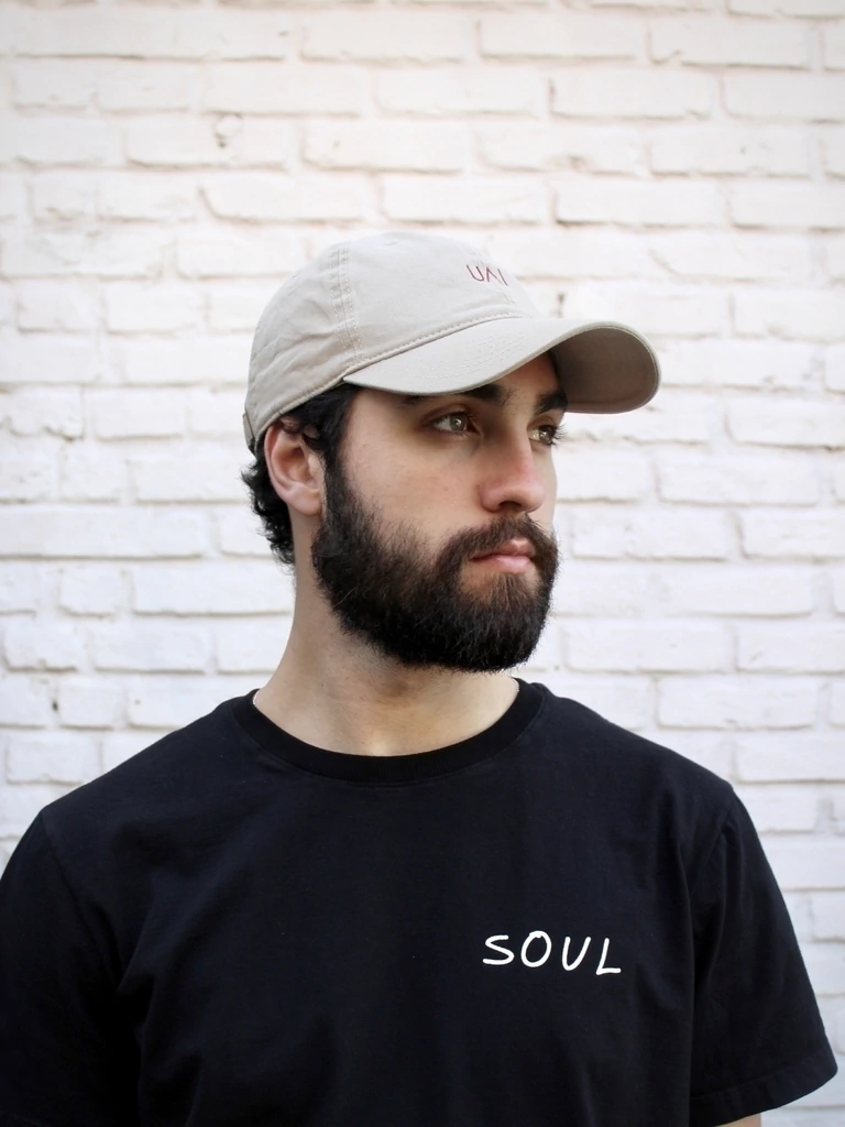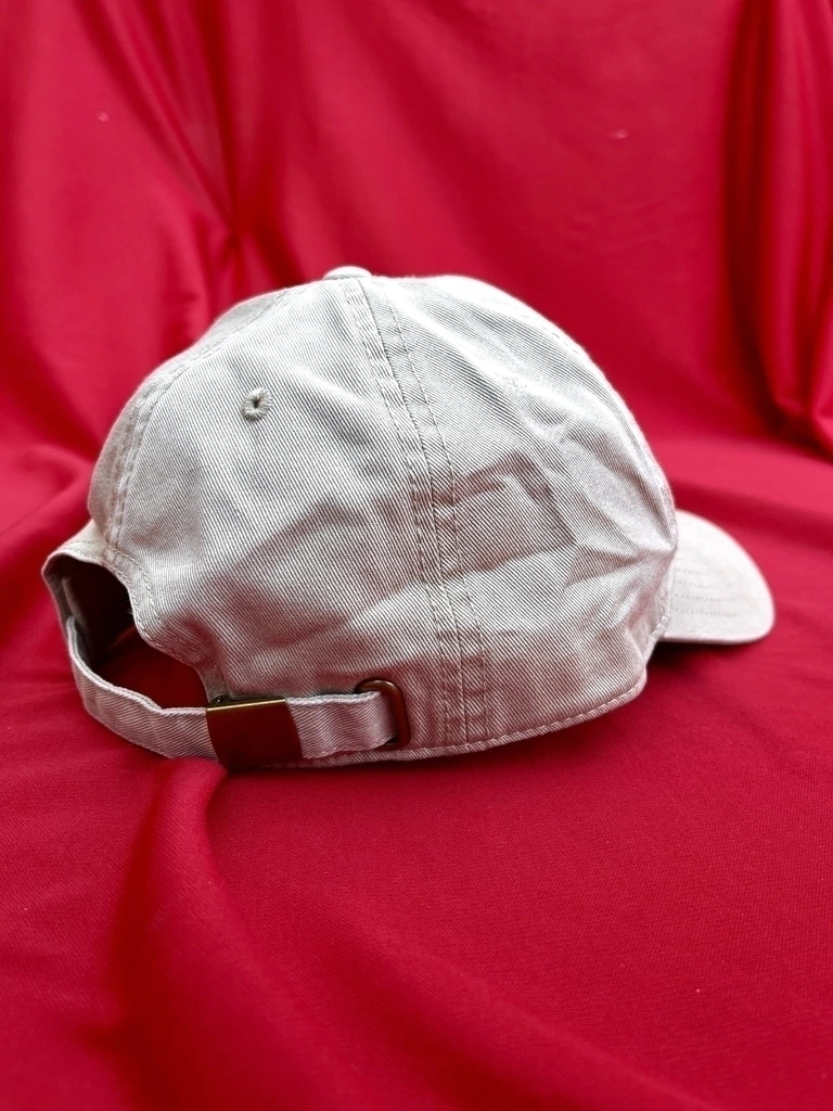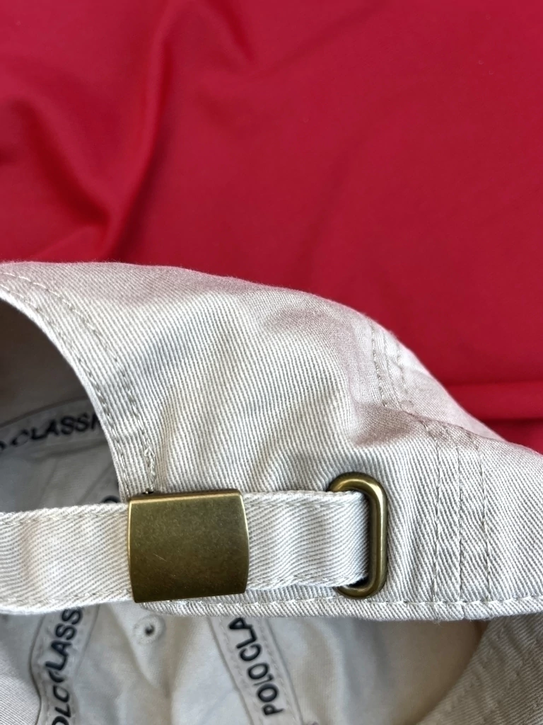 boné polo classic com aba curva bege com bordado vermelho, feito em sarja, regulagem de tamanho na parte posterior, feixo do tipo stapback.